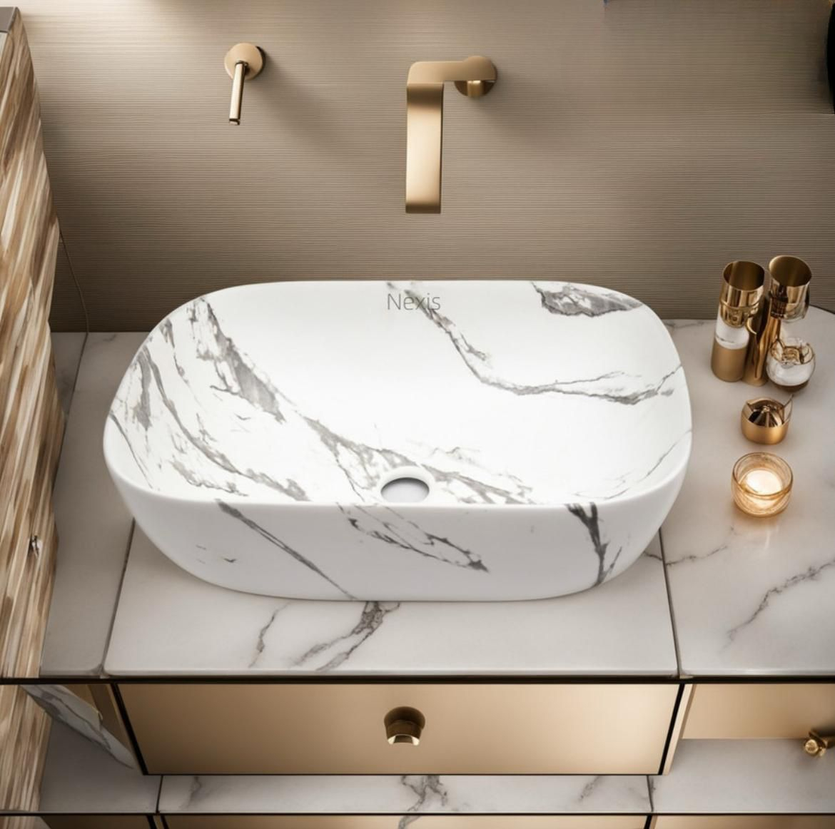 Premium marble finish ceramic wash basin with elegant design, perfect for modern and luxury bathroom interiors.